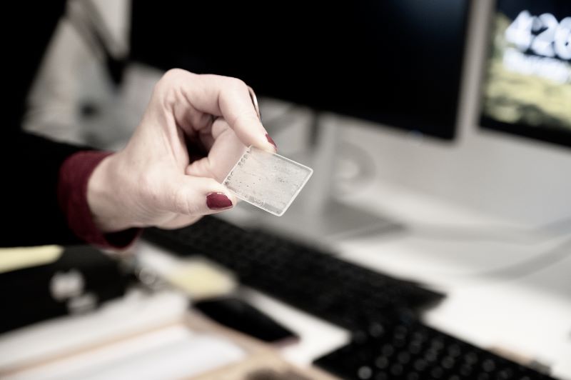 Loin d’une simple observation, Stéphanie Roland s’est approprié les outils scientifiques avec la complicité des nombreux chercheurs qui l’ont accueillie, Mary-Alix Kaczmarek, professeure associée à l’Université Paul Sabatier Toulouse III et du Groupe Geosciences Environement Toulouse (GET) ; Matthieu Sylvander, de l’IRAP/Observatoire Midi-Pyrénées ; Julien Berger, Vincent Regard et Soumaya Latour, Maîtres de conférence ; mais aussi Franck Vidal, de l’Institut Pluridisciplinaire pour les études sur les Amériques à Toulouse Université Jean Jaurès. Seule face aux microscopes, elle a filmé, manipulé, expérimenté. « Les scientifiques m’ont même laissé le laboratoire pendant une journée. J’ai pu faire mes propres prises de vue, jouer avec les couleurs, comme un chef opérateur », se réjouit-elle. De ces manipulations et ces prises de vues, sont nées des images abstraites, vibrantes, qui nourriront son installation.
