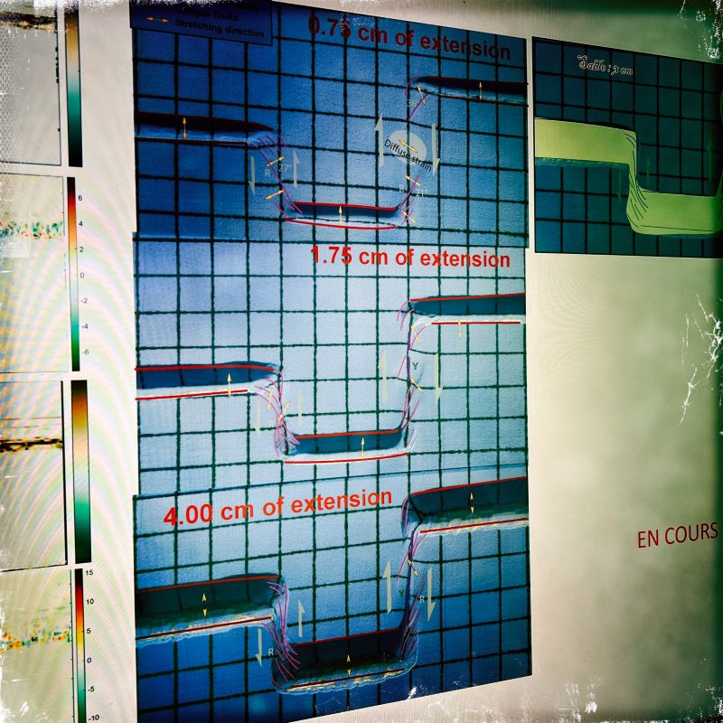 À Toulouse, en ce début de printemps, l’artiste a trouvé un terrain privilégié d’expérimentation. Pendant une semaine, elle a investi les laboratoires des universités toulousaines Paul Sabatier et Jean Jaurès, au contact de sismologues, de spécialistes des ruptures et de la pétrographie : « La pétrographie est l’observation de l’invisible dans les pierres. On coupe des lamelles très fines et, au microscope, on découvre un monde qu’on ne peut pas voir à l’œil nu. C’est magique.»