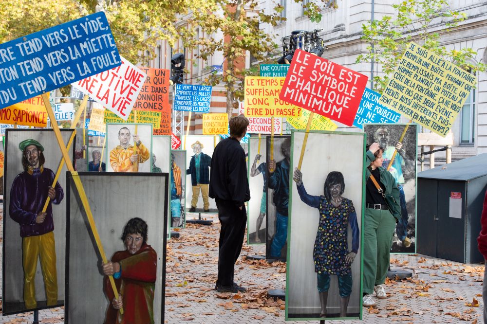 Promenez-vous au sein d’une foule de manifestants et découvrez leurs revendications. Entre poésie absurde et légèreté, l’installation rejoue avec humour les possibles d’une démocratie où chacun a droit à sa pancarte.