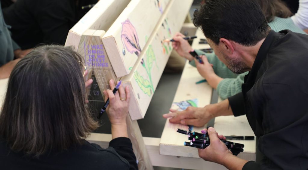 Quand la transgression devient œuvre collective ! Ce faux banc public, imaginé par les designeuses de candiD Atelier, a été transformé avec les participants de maisons de chômeurs de Toulouse, lieux d’accueil et d’accompagnement pour l’insertion sociale et professionnelle. Source de rencontres et favorisant la créativité, ce projet collectif est une manière symbolique de réinventer et de s’approprier l’espace public. N’hésitez pas à y ajouter à votre tour votre patte grâce au matériel mis à disposition !